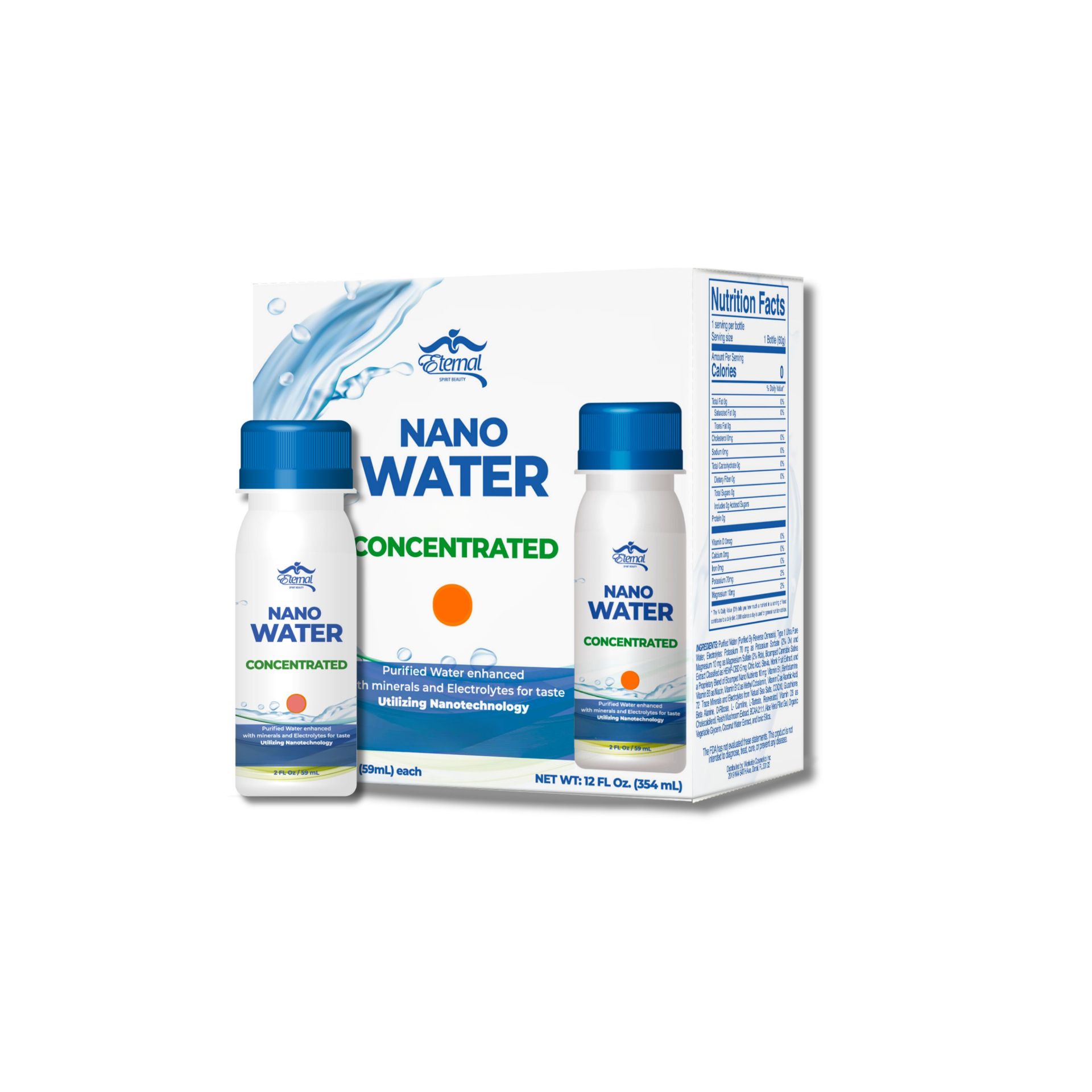 INGREDIENTES: Agua purificada (purificada por ósmosis inversa), agua ultrapura de tipo 1, electrolitos: Potasio 70 mg como Sorbato de Potasio (2% Dv) y Magnesio 10 mg como Sulfato de Magnesio (2% Rda), Ácido Cítrico, Stevia, Extracto de Fruta Monje, y una Mezcla Patentada de Nano Nutrientes Bioamplificados 10 mg: Vitamina B1, Benfotiamina, Vitamina B3 como Niacina, Vitamina B12 como Metil Cobalamina, Vitamina C como Ácido Ascórbico, 72 Oligoelementos y Electrolitos de Sales Marinas Naturales, COQ10, Glutatión, Beta Alanina, D-Ribosa, L-Carnitina, L-Tartrato, Resveratrol, Vitamina D3 como Colecalciferol, Extracto de Hongo Reishi, BCAA 2.1:1, Aloe Vera Filtrado, Stevia, Extracto de Fruta Monje, y una Mezcla Patentada de Nano Nutrientes Bioamped 10 mg: 1:1, Gel de Filete de Aloe Vera, Glicerina Vegetal Orgánica, Extracto de Agua de Coco y Sílice Iónica.